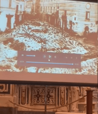 There's something strange and beautiful about seeing an image from a hundred years ago projected between the columns of a cathedral. As if time were folding back on itself, as if those faces and that rubble were still searching for someone willing to listen.